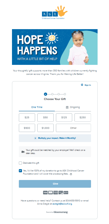 From the top of ASK Childhood Cancer Foundation’s donation page, you can see that the form is effectively branded with a logo and header reminding donors of the core mission. Additionally, they include a statement about exactly how many families donors’ contributions will help, allowing them to connect their donations to real impact.