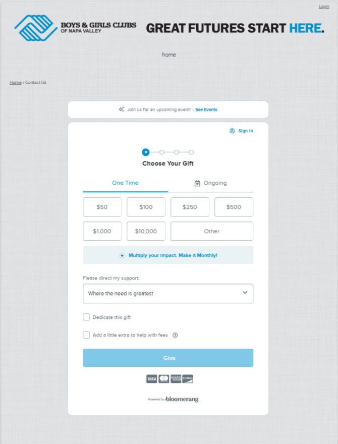 The Boys & Girls Clubs of Napa Valley’s donation form matches the branding for the rest of their site and donation page seamlessly, reassuring users that they’re in the right place. At the top of the form, there’s a link to the organization’s events page, which gives supporters another way to get involved. Lastly, the “Please direct my support” dropdown field allows donors to choose where they want their donations to go so they can actively make the impact they seek.