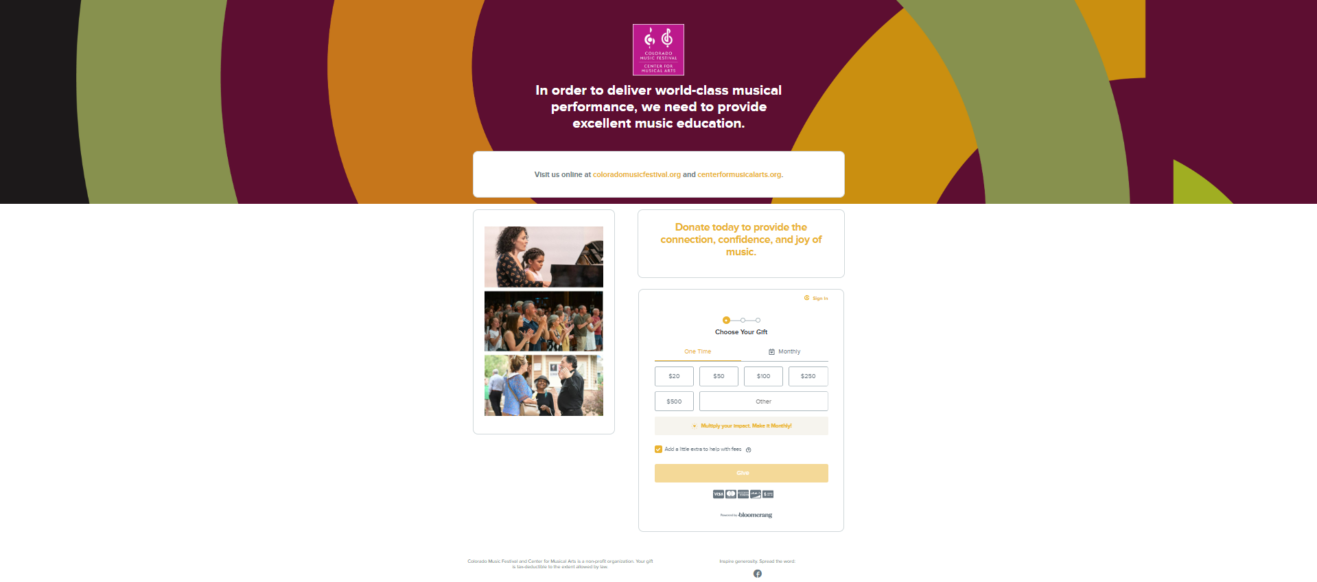 The Colorado Music Festival has configured the rest of its donation page to match the styling of the donation form, fully integrating the form into the page and offering a seamless giving experience. Next to the form, there are pictures of the music festival in action, showing donors the work they’ll support.