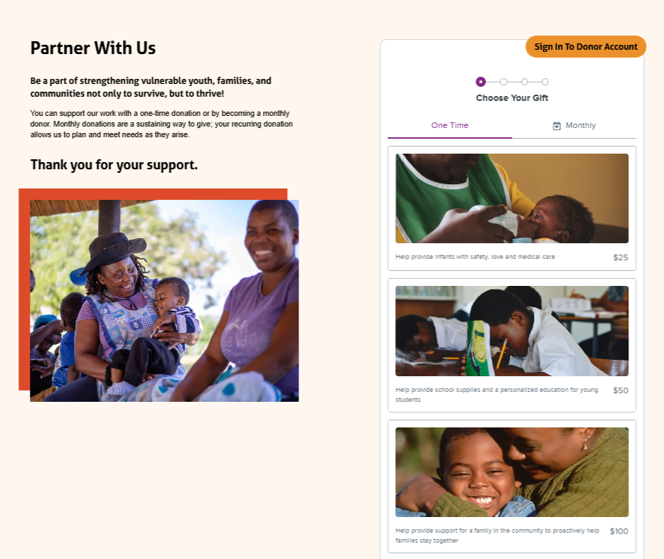 Kuda Vana Partnership uses a multistep form and elevates it to another level by incorporating impactful images. Each suggested donation amount is accompanied by an image of a child in need, helping donors put a face to those served by Kuda Vana.