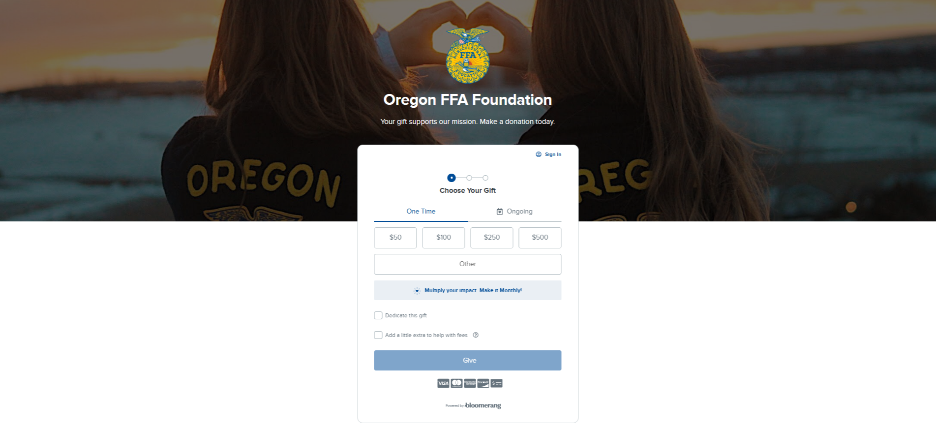 Oregon FFA Foundation’s donation form includes a checkbox for donors to dedicate their gift in honor of a loved one. When supporters click the box, they’re prompted to choose the type of dedication and who they want to dedicate the donation to. They can also send a message to the person they’re contributing on behalf of.