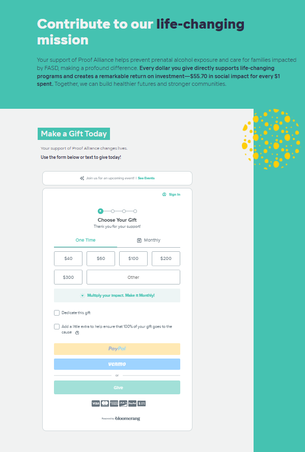 Proof Alliance also offers a checkbox for donors to cover processing fees that explains the purpose behind it. By explaining that donors can “Add a little extra to help ensure that 100% of your gift goes to the cause,” they underscore the importance of offsetting these costs and encourage donors to opt in.
